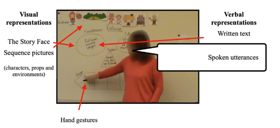 I avhandlingens multimodala analyser blir det också tydligt hur flera överlappande teckensystem uppmärksammar specifika berättelseelement. Dessa överlappningar diskuteras som intermodala genom att lärarna använder (1) gester för att peka på (2) visuella delar av den grafiska modellen som har en (3) skriven benämning som lärarna ofta benämner muntligt (4). I iscensättningarna är det didaktiska värdet således inte att flera teckensystem används, utan hur de används överlappande för att explicitgöra ett ämnesinnehåll.
