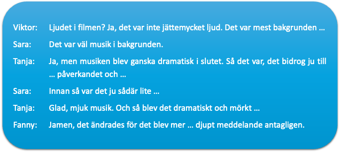 Eleverna är inte riktigt vana vid att under textsamtal uppmärksamma och beskriva olika modaliteter, i det här fallet ljud, hur de används och vad de betyder för tolkningen av texten som helhet. Viktor och Sara har lagt märke till att det finns musik i bakgrunden, men inte så mycket mer än så. Tanja har däremot noterat att musiken förändras under filmens gång, från mjuk och glad musik i filmens inledning till dramatisk och mörk, något som hon menar bidrar till ”påverkandet”. Hennes iakttagelse stämmer väl överens med filmens dramaturgi som i inledningen följer en flicka med valmöjligheter i livet men sedan skiftar miljö och perspektiv och följer en flicka som blir bortgift mot sin vilja och därmed får ge upp sina drömmar. Det mörka slutet och vad det förmedlar till den som tittar kallar Fanny ”djupt meddelande”. Trots sin ovana att tala om ljudets betydelse lyckas eleverna ändå ringa in det skifte som äger rum och att musiken är en del av hur detta skifte gestaltas.